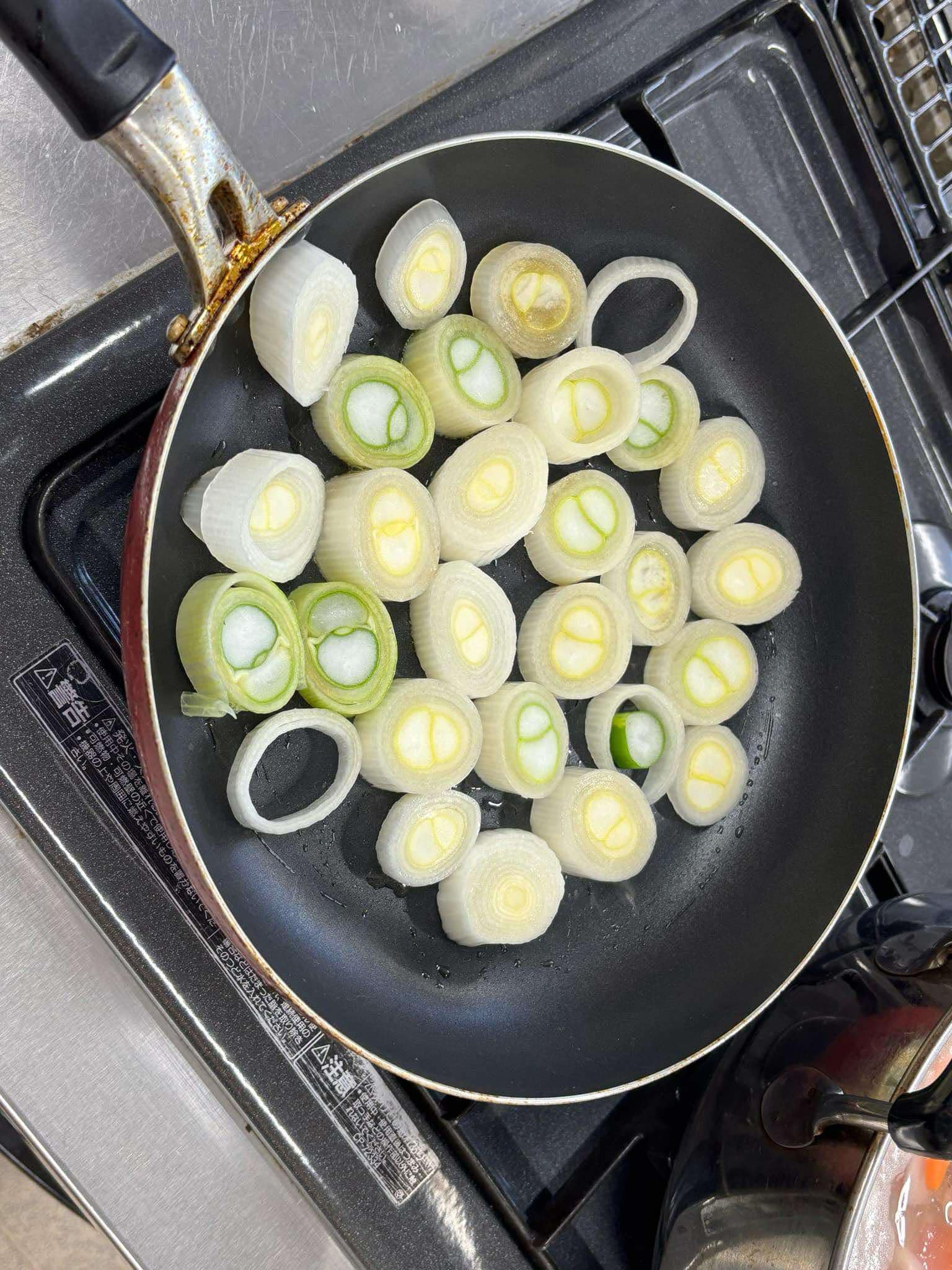 フライパンに入るとネギの太さがわかります。立派なネギです!